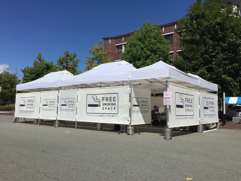イベント会場にて喫煙所を設置。天幕・横幕は煙の循環を良くするために、風抜き・メッシュ窓仕様にしています。